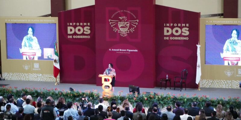 Al compás de la “Marcha Imperial” de Star Wars, la alcaldesa de Playas de Rosarito, Baja California, Araceli Brown hizo su entrada para rendir su segundo informe de gobierno en la Casa Municipal.
