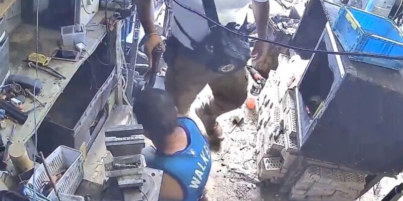 La situación se torna aún más alarmante cuando uno de los presuntos agentes de la Fiscalía saca un arma y la dirige hacia la cabeza del herrero, infundiendo miedo en la víctima que lucha por protegerse en el suelo.