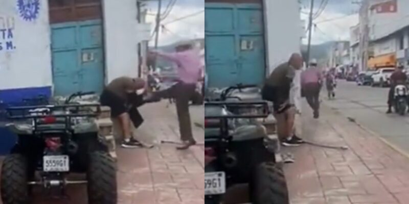 “Esperece, mi rodilla esta operada… ¡Ayuda!” se escuchó gritar a la víctima, mientras que la mujer que capturó el suceso le menciona “el señor esta discapacitado”.