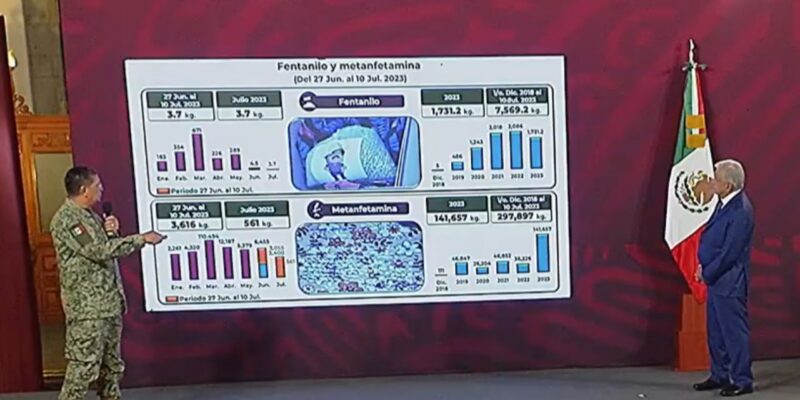 Por su parte, el secretario de la Defensa Nacional dio a conocer que del 27 de junio al 10 de julio se incautaron 3.7 kilogramos de fentanilo y en lo que va del año han asegurado mil 731 kilogramos de la droga sintética, así como siete mil 569 kilogramos durante la administración de López Obrador.