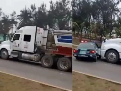 Tráiler impacta y arrastra patrulla de tránsito con oficiales dentro en Veracruz