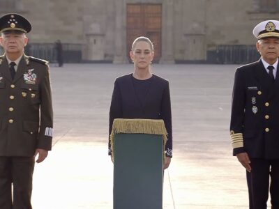 La presidenta de México, Claudia Sheinbaum Pardo, lideró la Ceremonia de Izamiento de la Bandera Nacional a media asta en la Plaza de ...