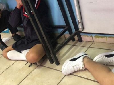Niños de la Escuela Primaria Luis Donaldo Colosio, en Culiacán, Sinaloa, se vieron obligados a refugiarse debajo de las mesas de sus salones después de ...