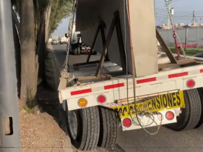 Tráiler con trabe de concreto queda varado en Eje 5 Sur, en Iztapalapa