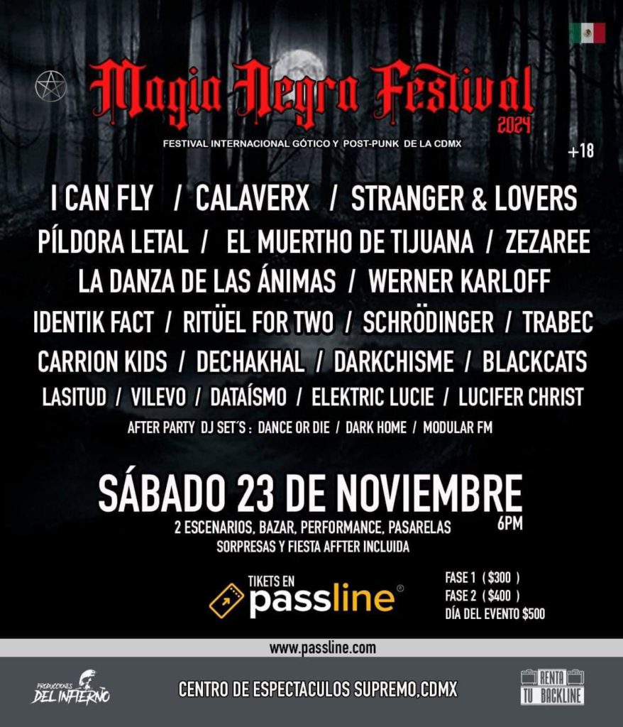 El evento que todos los amantes de la música oscura han estado esperando está a punto de regresar a la Ciudad de México. El Festival Magia Negra, conocido por ser «La Noche Más Oscura del Año», está de vuelta con su esperada cuarta edición que promete superar todas las expectativas. Esta cuarta edición se llevará a cabo se llevará a cabo el próximo 23 de Noviembre en Supremo, ubicado en Dr. Carmona y Valle 147, Colonia Doctores, Cuauhtémoc, Ciudad de México y los boletos ya están a la venta en el Sistema Passline.