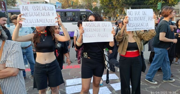 Amigos y familiares se manifestaron durante más de una hora frente a las oficinas de la FGJ, donde colocaron pancartas y carteles con mensajes de exigencia de justicia tanto para «Bere» como para Miguel Ángel.