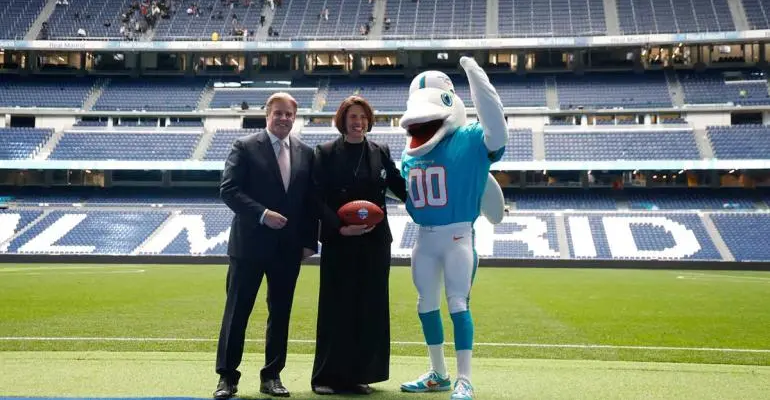 El anuncio de que los Dolphins serán uno de los dos equipos de la liga profesional de fútbol americano que se enfrentarán -por primera vez en España- en el Bernabéu tuvo lugar este viernes en el citado estadio madrileño, en un acto al que asistieron, entre otros, Brett Gosper, director de la NFL en Europa y Asia-Pacífico; Pri Shumate, vicepresidenta de los Miami Dolphins; y Florentino Pérez, presidente del Real Madrid.