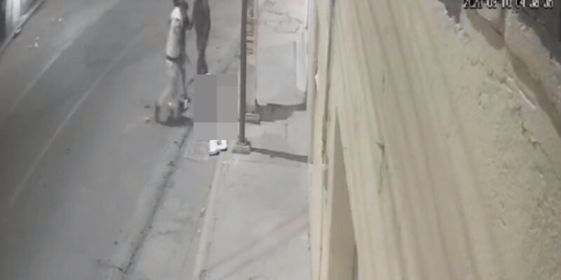 Después de alejarse, uno de los agresores regresa para seguir golpeándolo con una piedra en la cabeza nueve veces más antes de retirarse.