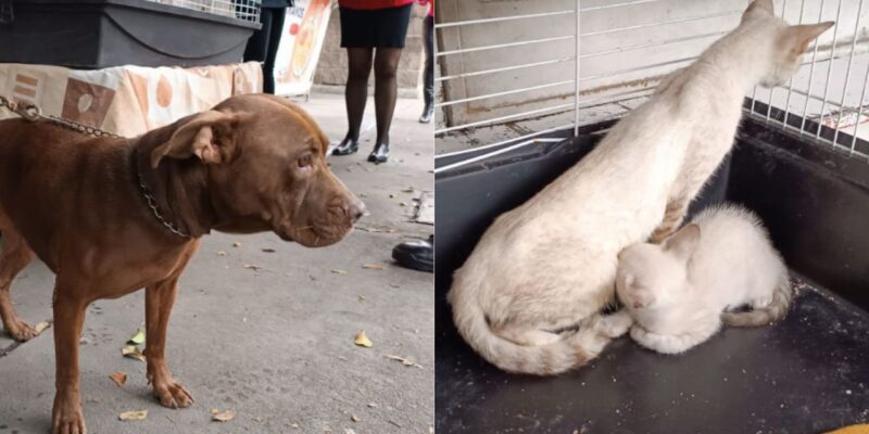 Los oficiales hallaron a los 15 gatitos dentro de tres jaulas, mientras que el perrito de raza pitbull, el cual se encontraba amarrado con una cadena a un puesto de comida, por lo elementos de la Brigada de Vigilancia animal los aseguraron.