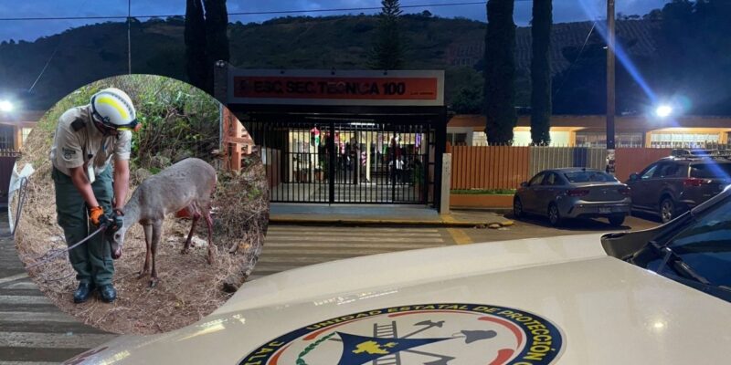 La Unidad Estatal de Protección Civil y Bomberos Jalisco llevó a cabo el rescate exitoso de un venado herido en la Secundaria Técnica 100 de Ciudad Guzmán.