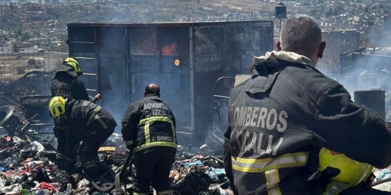 Bomberos de Atizapán y de Nicolás Romero ya acudieron al lugar para controlar el fuego en la zona donde se observan varios residuos de pet, así como vehículos afectados por el incendio.