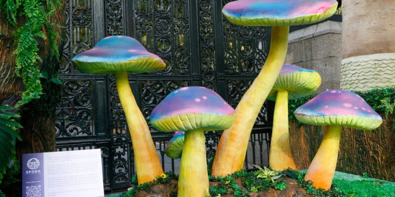Instalaciones artísticas con seis esculturas monumentales de macrohongos y una puerta gigante inspirada en distintas especies.