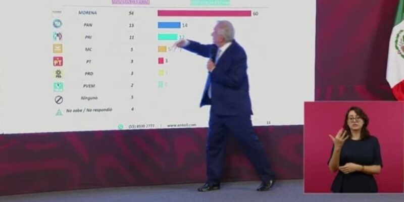 En la mañanera del 26 de julio, el Presidente López Obrador había exhibido dos sondeos de opinión que mostraban a Morena con una ventaja de más de 30 puntos sobre la Oposición, utilizando para ello una sección llamada “No lo digo yo”.